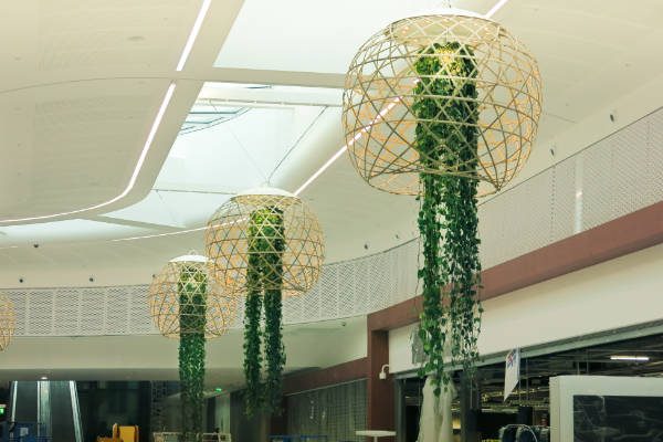 Otto sfere dal diametro di 240 cm fanno da cornice a piante sospese a sette metri di altezza, nel centro commerciale recentemente sorto ad Aubervilliers, presso Parigi.